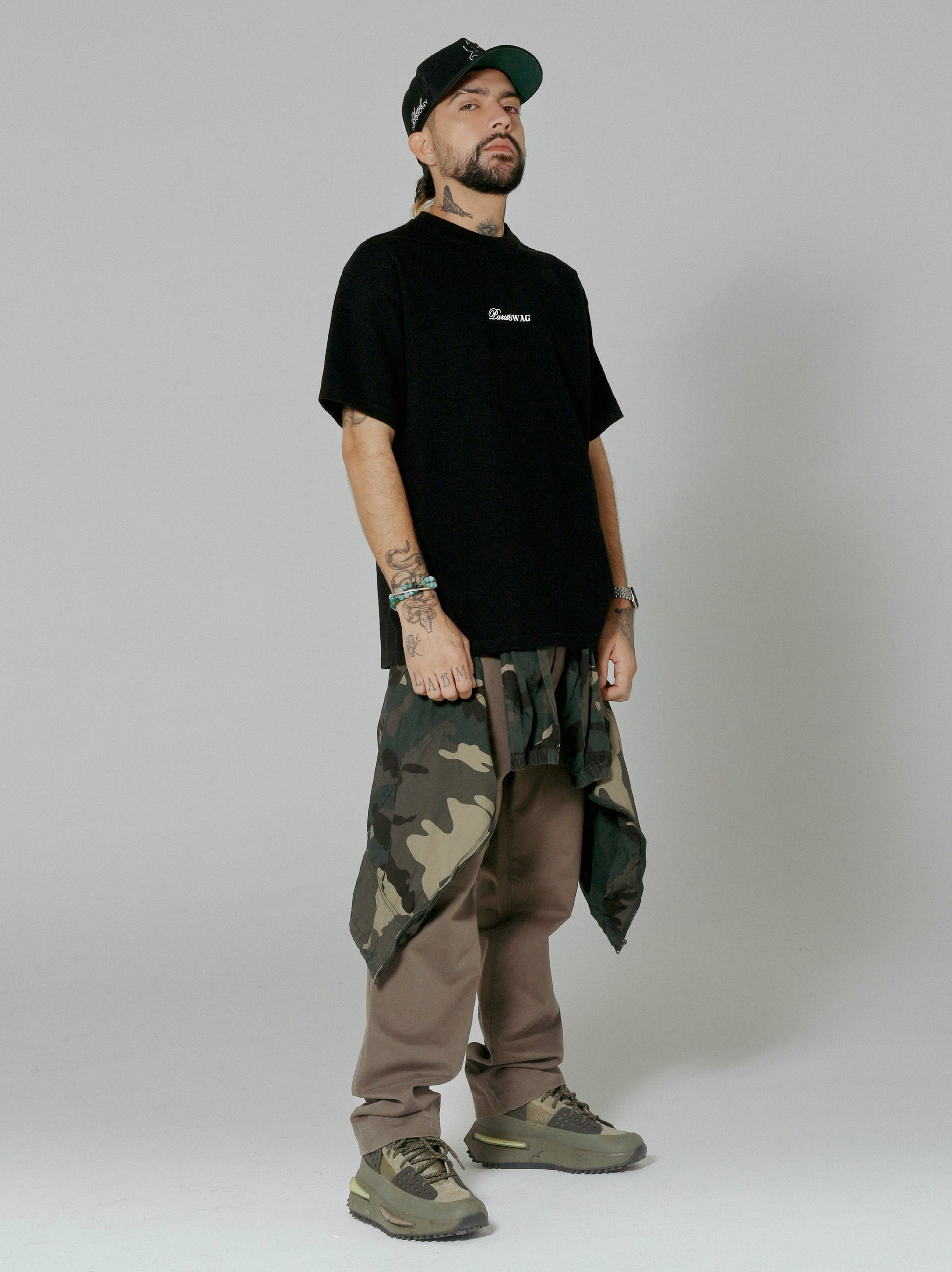 Actitud firme y estética limpia. Camiseta negra con tipografía trasera en blanco y detalle frontal sutil. Su construcción en algodón suave la hace ideal para un uso constante.