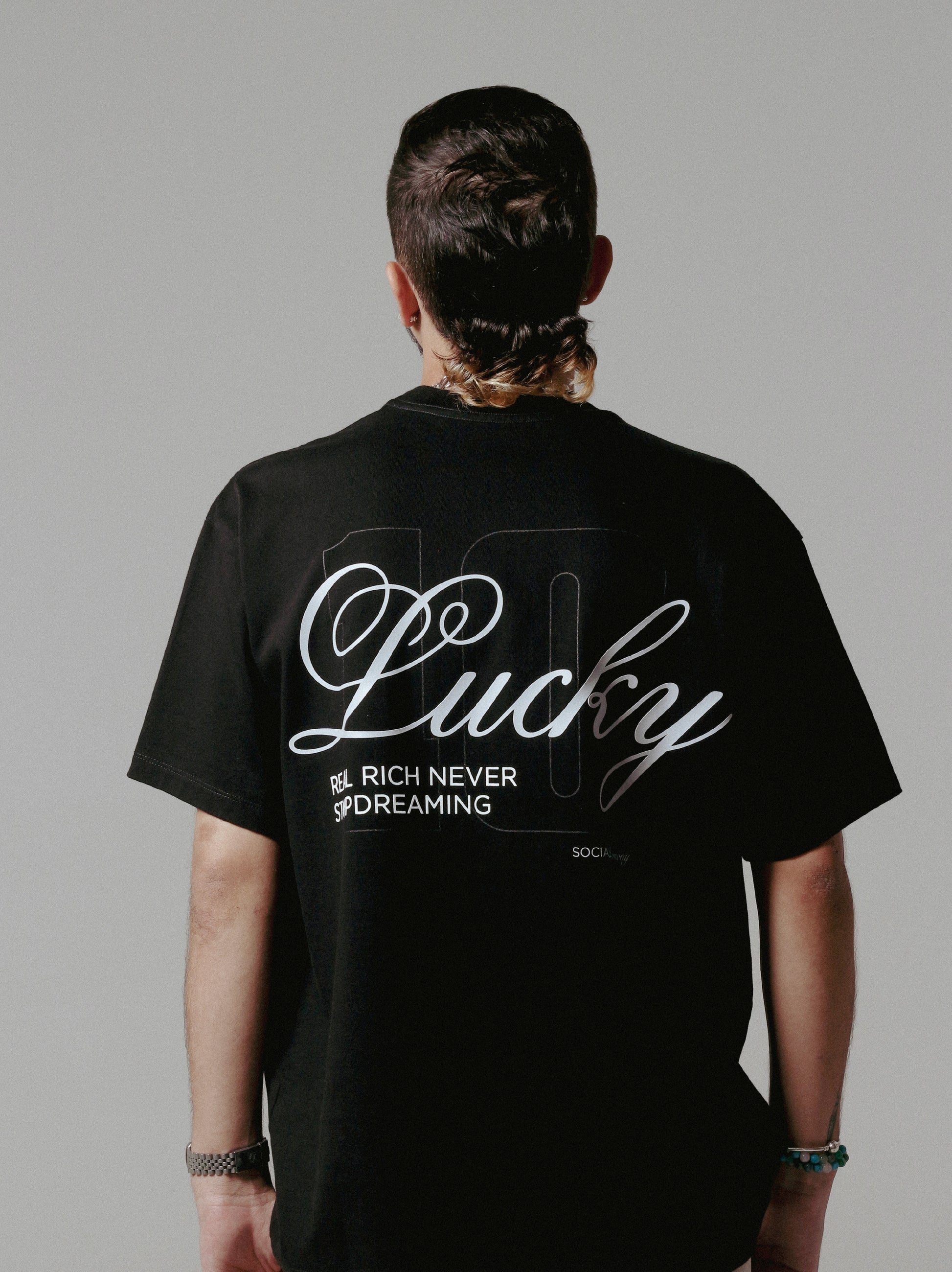 Elegancia urbana con mensaje. Camiseta negra con tipografía trasera de gran formato y detalle frontal minimal. Confeccionada en algodón suave para una silueta cómoda y moderna.